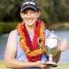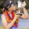 Angela Stanford holds the trophy after winning the final round of the SBS Open golf tournament at the Turtle Bay Resort in Hawaii. (AP Photo/Marco Garcia)